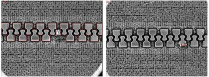 3.拉鏈檢測:可對各類型金屬、塑膠、尼龍拉鏈進(jìn)行正反面鏈齒檢測,檢測是否缺失鏈齒,檢測鏈齒壓傷、劃傷不良等。