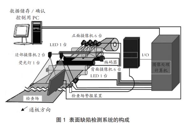 表面缺陷檢測(cè)系統(tǒng)的基本結(jié)構(gòu)如圖1所示。這樣的構(gòu)成裝置是,①攝像機(jī)和光源(LED、熒光燈等)、②圖像處理計(jì)算機(jī)、③數(shù)據(jù)儲(chǔ)存/確認(rèn)控制用PC。表面缺陷檢測(cè)系統(tǒng)將攝像機(jī)拍攝到的被檢查對(duì)象的連續(xù)圖像輸送到圖像處理計(jì)算機(jī),對(duì)圖像進(jìn)行實(shí)時(shí)處理,根據(jù)圖像的色調(diào)深淺對(duì)缺陷進(jìn)行判定檢查。檢查結(jié)果被輸送到數(shù)據(jù)儲(chǔ)存/確認(rèn)控制用PC。PC上顯示出帶鋼展開(kāi)圖和缺陷圖像,并保存在PC中。當(dāng)檢查到缺陷時(shí),警報(bào)器發(fā)出警告鳴聲。