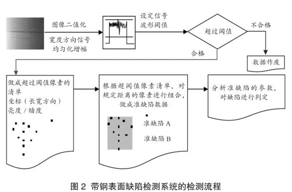 圖2是表面缺陷檢測(cè)系統(tǒng)判定缺陷方法的概略圖。將來(lái)自光源的透射光或反射光進(jìn)行二值化處理后,利用軟件或光源輸出功率調(diào)整的方法使檢測(cè)信號(hào)增幅(標(biāo)準(zhǔn)化處理),然后對(duì)二值化信號(hào)設(shè)定閾值。對(duì)檢測(cè)出超過(guò)閾值的信號(hào)的像素位置信息和信號(hào)強(qiáng)度進(jìn)行列表。根據(jù)規(guī)定條件,制成準(zhǔn)缺陷圖像數(shù)據(jù)。利用準(zhǔn)缺陷圖像的大小、形狀、色調(diào)深淺、位置等參數(shù)對(duì)檢測(cè)到的圖像進(jìn)行細(xì)致判斷,判定檢測(cè)到的圖像是否是缺陷。