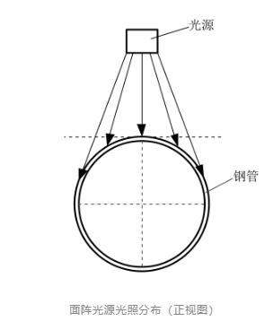 平面材料表面缺陷檢測的光照分布示意圖對于鋼管而言,因其幾何結構特點,當采用面陣光源時,弧形外表面使得光源中心與被照射區(qū)域各處之間距離相差過大,如圖所示,與光源最短距離位置處表現為較高亮度,而在最短距離位置兩測,光照亮度分布減弱,圖像成像結果也表現類似特點,中間區(qū)域像素灰度分布較高而兩側區(qū)域像素灰度值較小。