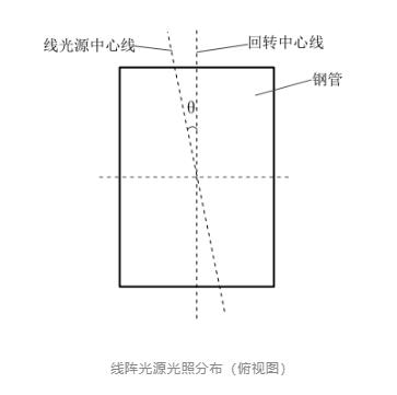 面陣光源光照分布(正視圖)另一情況如圖所示,采用線陣相機和線陣光源實現鋼管表面缺陷動態(tài)檢測時,因振動、裝配誤差等因素,線陣光源中心線與線陣相機視野長度方向并非位于同一直線,相機視野方向通常與鋼管回轉中心所在直線一致;這種情況會降低照射區(qū)域與視野區(qū)域重合性,導致成像結果光照不均現象嚴重,進一步增加圖像處理的困難度。