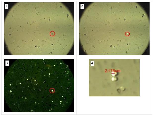 經(jīng)測(cè)量,圖2中的兩個(gè)明顯的透光點(diǎn)的直徑在2微米左右。參見圖4。