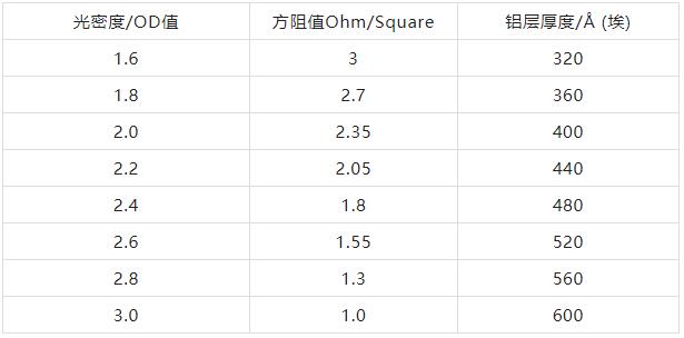 從上述對(duì)照表中可以查出,光密度值2.4所對(duì)應(yīng)的鍍鋁層厚度為480Å(埃)(0.048微米)。