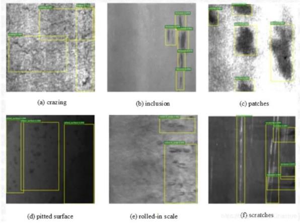 由東北大學(NEU)發(fā)布的表面缺陷數(shù)據(jù)庫,收集了熱軋鋼帶的六種典型表面缺陷,即軋制氧化皮(RS),斑塊(Pa),開裂(Cr),點蝕表面( PS),內含物(In)和劃痕(Sc)。該數(shù)據(jù)庫包括1,800個灰度圖像:六種不同類型的典型表面缺陷,每一類缺陷包含300個樣本。對于缺陷檢測任務,數(shù)據(jù)集提供了注釋,指示每個圖像中缺陷的類別和位置。對于每個缺陷,黃色框是指示其位置的邊框,綠色標簽是類別分數(shù)。