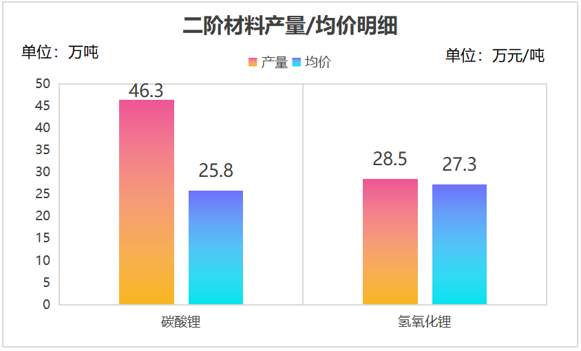 二階材料環(huán)節(jié),1—12月碳酸鋰、氫氧化鋰產(chǎn)量分別約46.3萬噸、28.5萬噸,電池級碳酸鋰、電池級氫氧化鋰(微粉級)均價分別為25.8萬元/噸和27.3萬元/噸。
