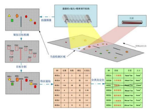 本臺(tái)設(shè)備安裝在銅箔分切機(jī)上,基本原理是將工業(yè)線陣 CCD 相機(jī)架設(shè)在材料上下表面兩側(cè),采用高亮 LED 線性聚光冷光源將材料表面照亮,通過(guò)編碼器 觸發(fā)相機(jī)進(jìn)行在線高速掃描式拍攝。高速圖像處理系統(tǒng)實(shí)時(shí)獲取銅箔表面壓坑、黑點(diǎn)、黑線、氧化斑、異物、劃傷、銅粉、銅粒、凹凸點(diǎn)、墊傷、污染、 褶皺、氧化、針孔等缺陷,系統(tǒng)通過(guò)數(shù)據(jù)庫(kù)來(lái)記錄和管理缺陷的橫縱向位置、 數(shù)量、大小和圖像等信息,可通過(guò)信號(hào)控制系統(tǒng)實(shí)時(shí)進(jìn)行聲光報(bào)警、缺陷記錄、自動(dòng)貼標(biāo)等操作。通過(guò)軟件深度學(xué)習(xí)最終實(shí)現(xiàn)缺陷的分類。LBX機(jī)器視覺(jué)檢測(cè)設(shè)備_CCD視覺(jué)檢測(cè)_外觀缺陷檢測(cè)系統(tǒng)_精質(zhì)視覺(jué)