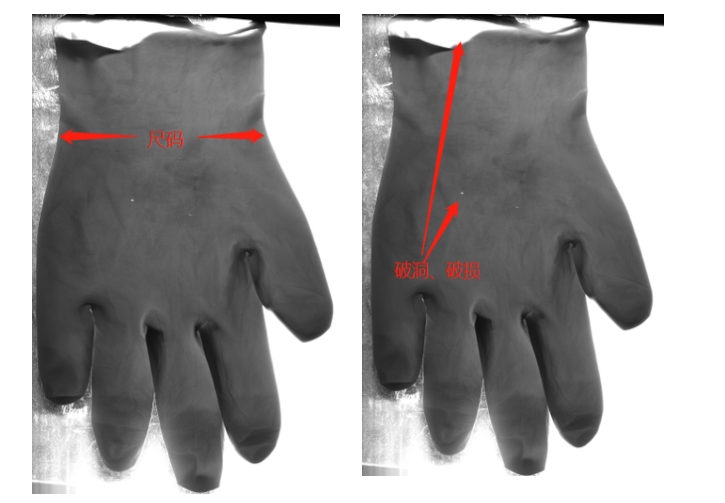 在手套的實(shí)際生產(chǎn)過程中,由于各方面因素的影響,手套表面會(huì)出現(xiàn)孔洞等瑕疵,嚴(yán)重影響了手套的質(zhì)量,給生產(chǎn)商帶來了不必要的損失。人眼往往不能及時(shí)準(zhǔn)確的判斷出瑕疵,而手套檢測(cè)系統(tǒng)能在線對(duì)生產(chǎn)過程中產(chǎn)生的表面缺陷瑕疵進(jìn)行高速、精確的檢測(cè),顯示和識(shí)別手套表面上的缺陷。